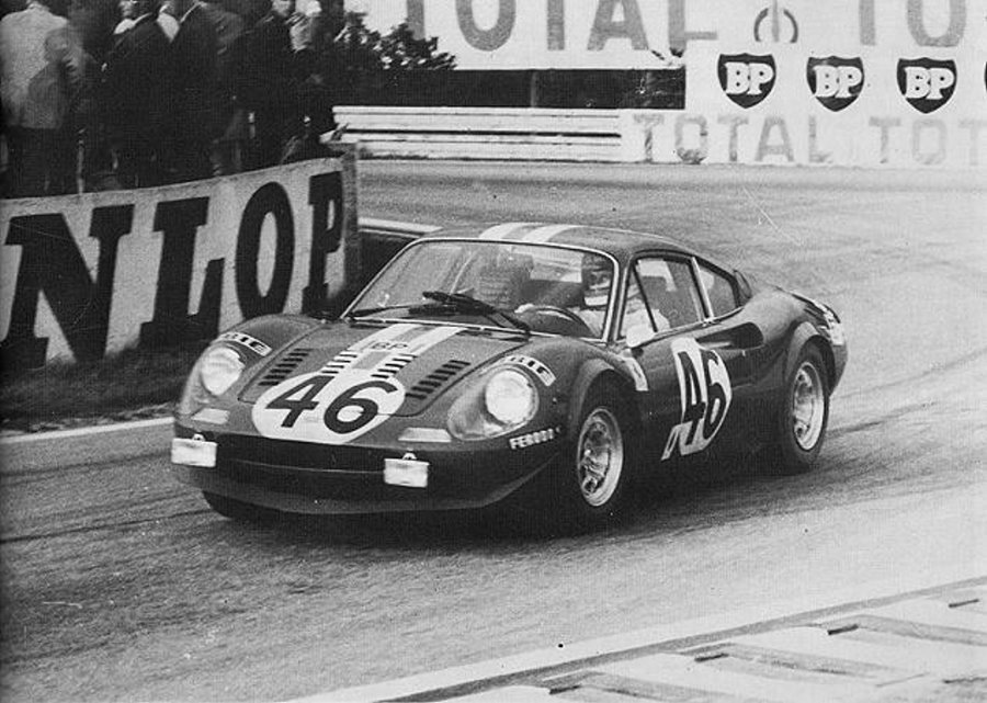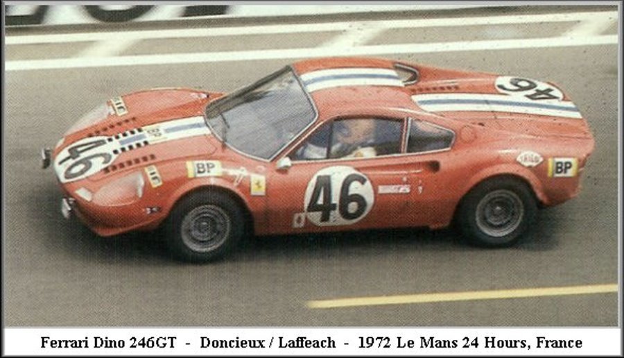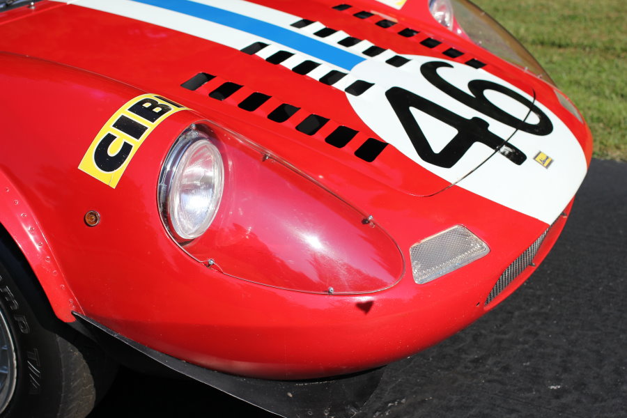 During the Wednesday time trails preceding the 1972 Le Mans race, Chinetti had both Sam Posey and Tony Adamowicz, who were slated to drive one of the N.A.R.T. Daytonas, take 02678 out for a few laps to ensure that the Dino was in proper order before handing it over to French amateurs, Pierre Laffeach and Gilles Doncieux. Both Posey and Adamowicz spun the car and the result was a crumpled front spoiler. The additional fuel weight in the very back of the car caused it to be slightly unstable when filled. As the result of another spin on Thursday by Laffeach, the front spoiler was enlarged to help compensate for the rear weight bias. During the race Laffeach spun again, same spot, this time backing into a guardrail damaging the left rear corner slightly. As it turned out, the fuel cell only needed to be filled half way between driver changes. 02678 had a successful race at LeMans, however, with Laffeach and Doncieux bringing the car to a 17th place overall and 2nd in class finish.