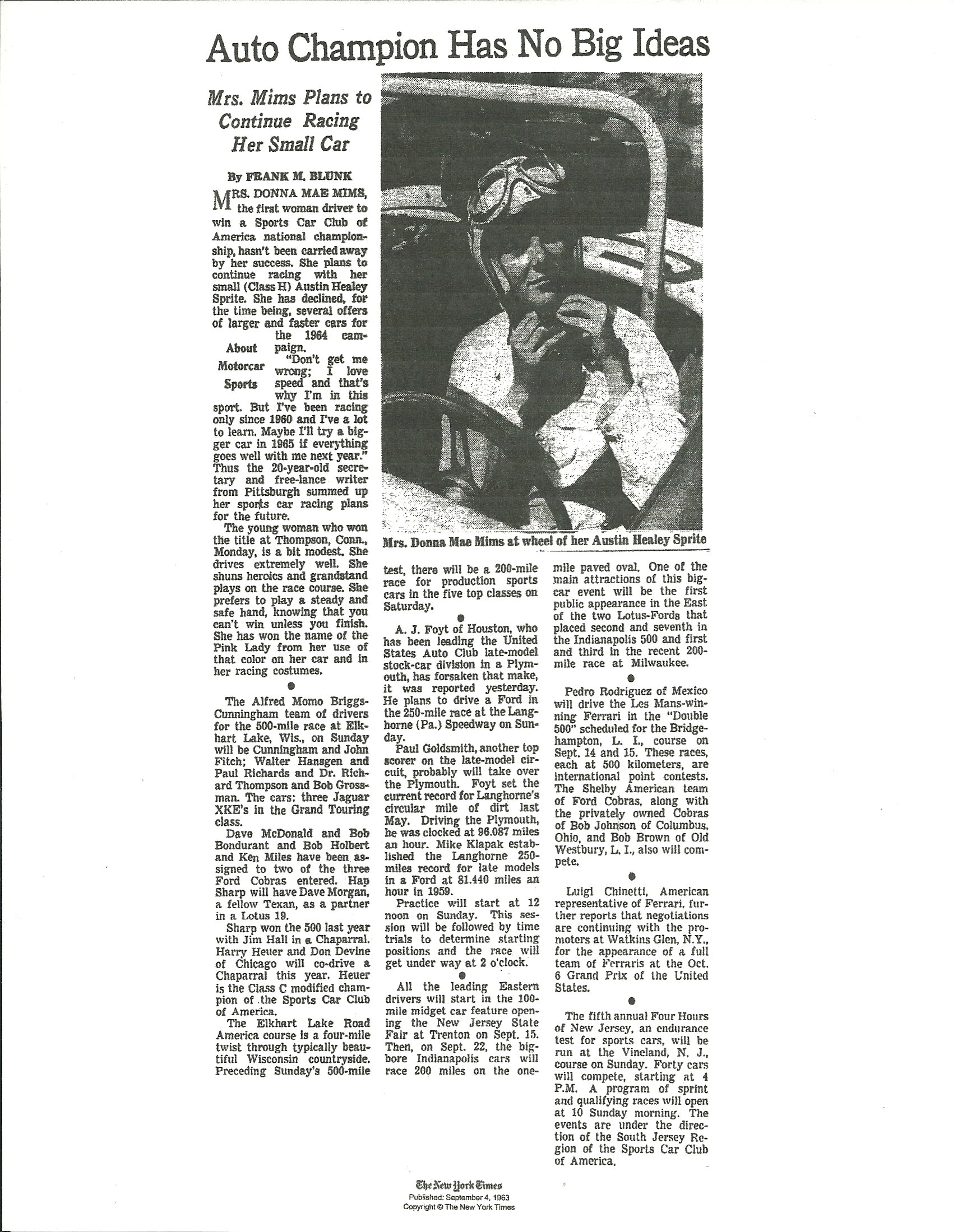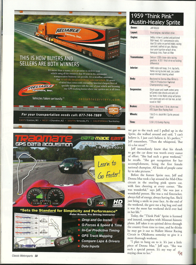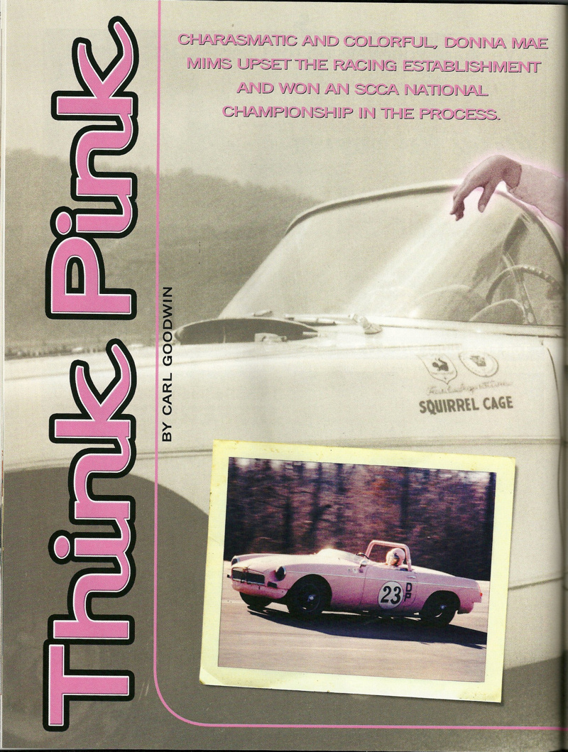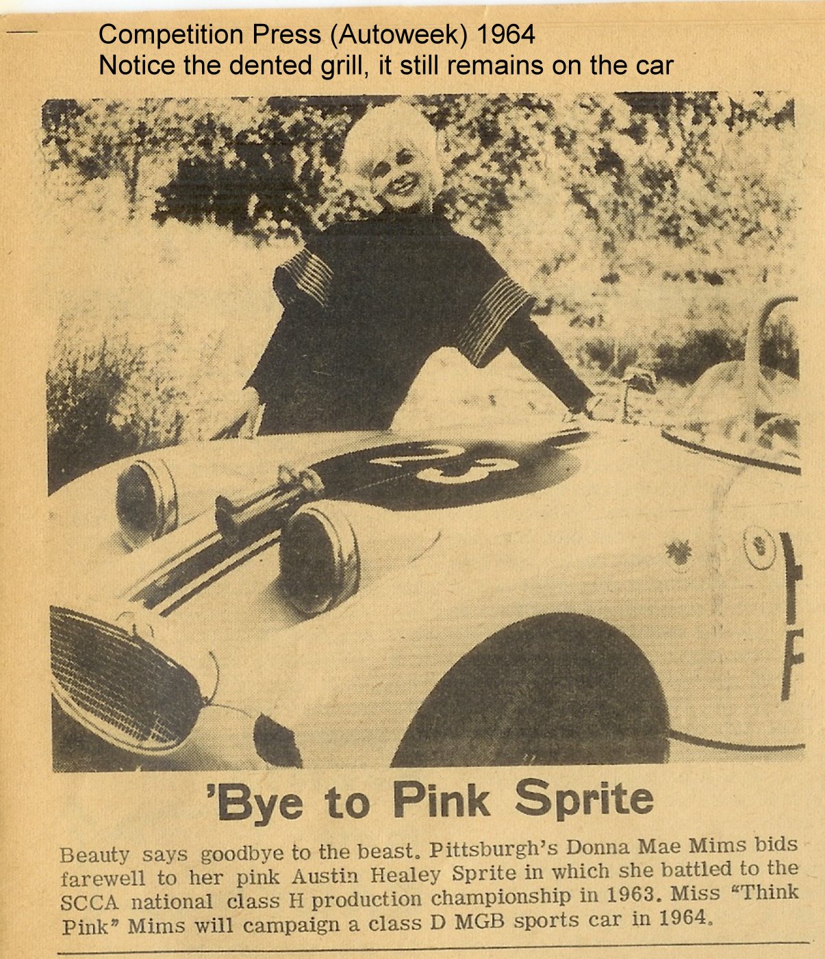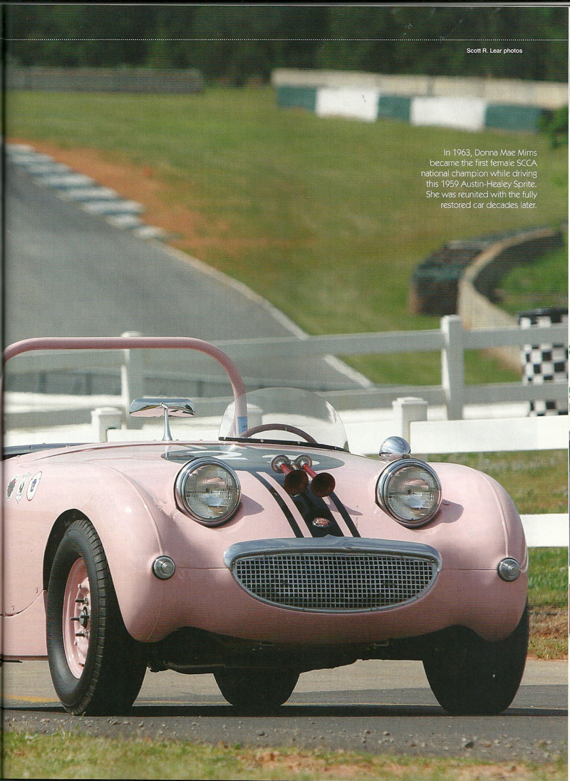 Ms. Mims competed with the Sprite at many famous race circuits such as: VIR, Road America, Marlboro, Mid-Ohio, Road America, Watkins Glen, Bridgehampton, Lime Rock, Meadowdale, Thompson, and Lake Garnett. Ms. Mims would later go on to compete in several Daytona 24hrs, 12hrs of Sebring, SCCA Trans Am, and IMSA events. Several of these races she was a member of the Ring Free Oil Company “all female” race team.
