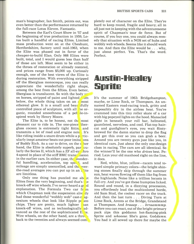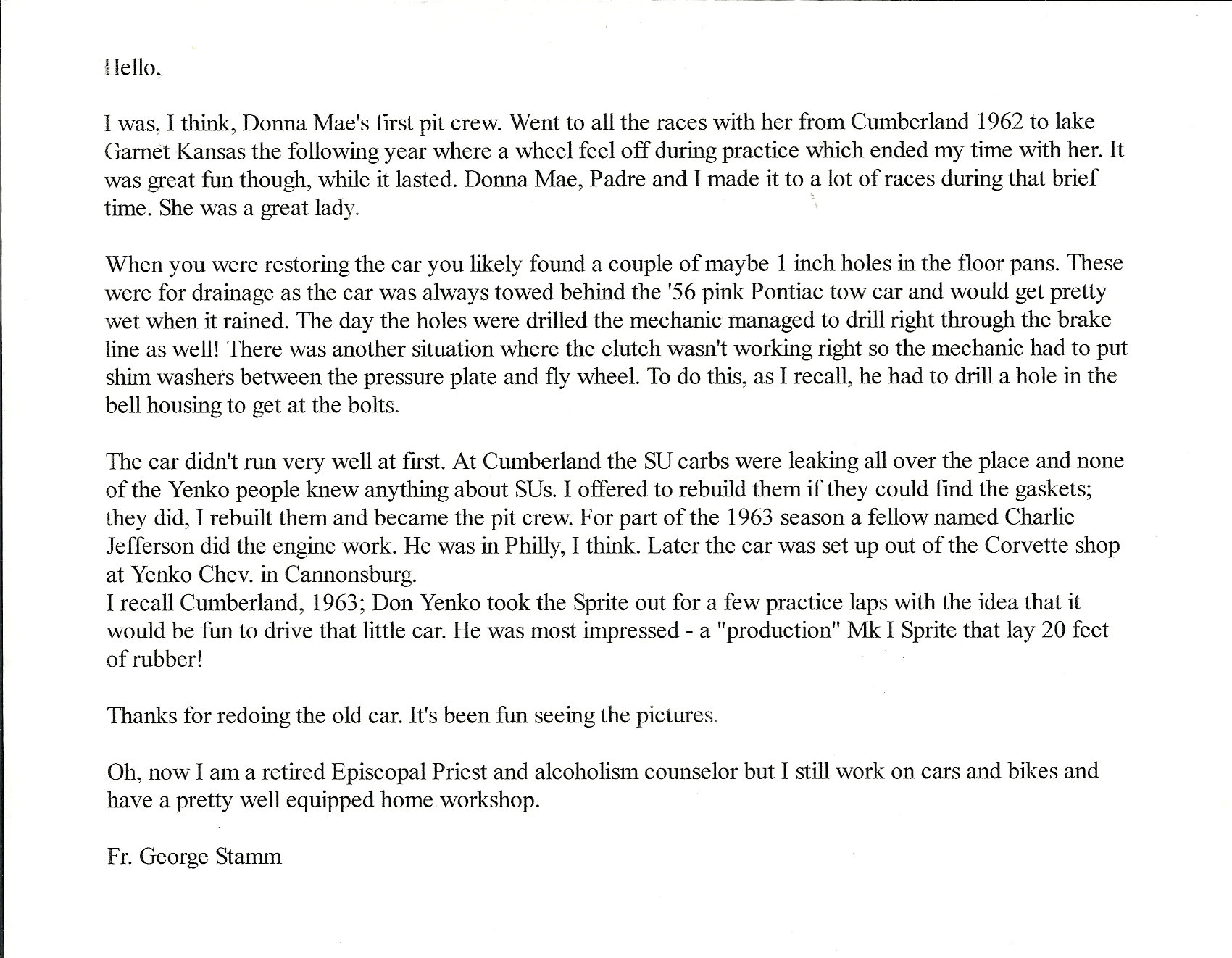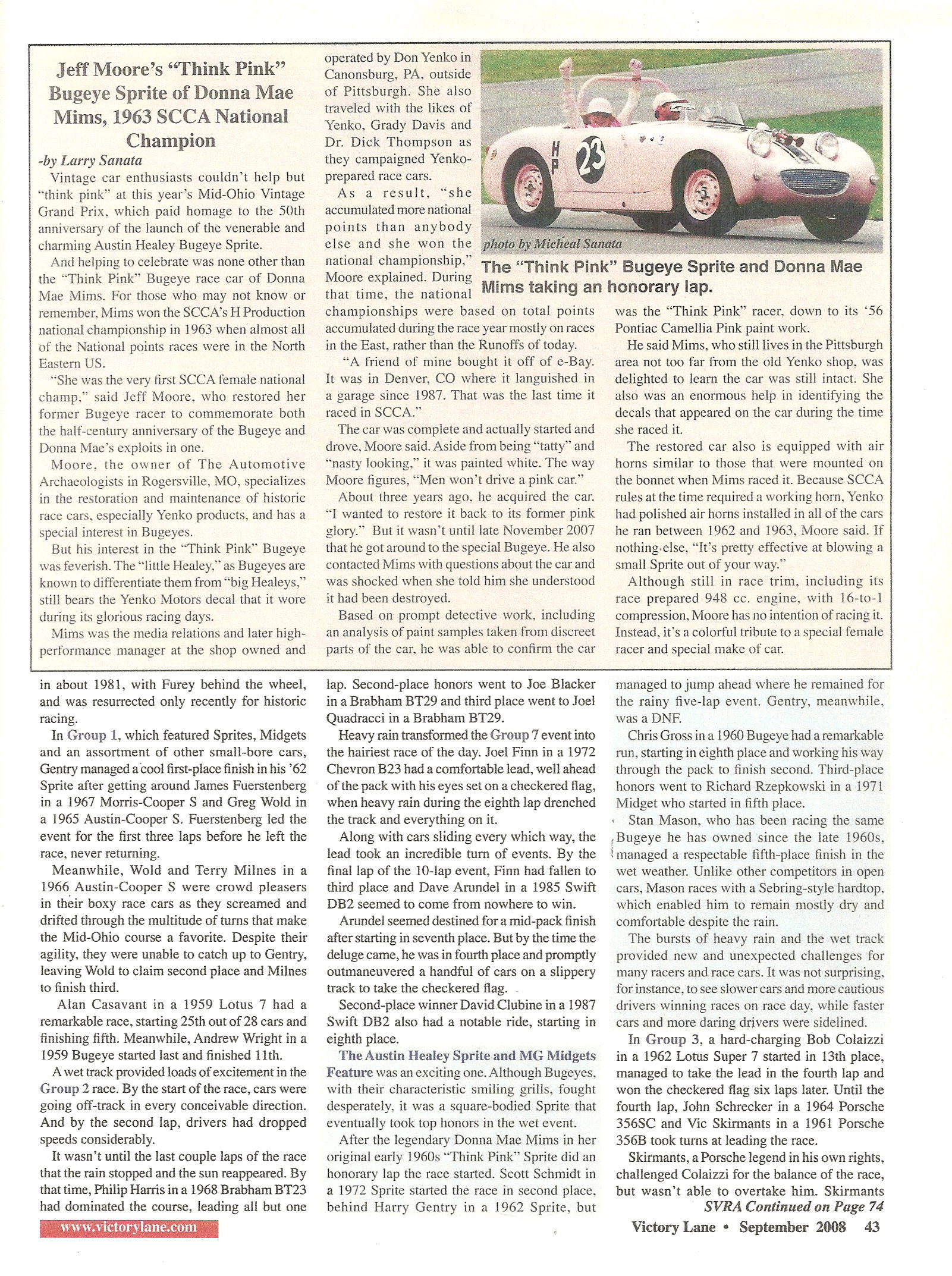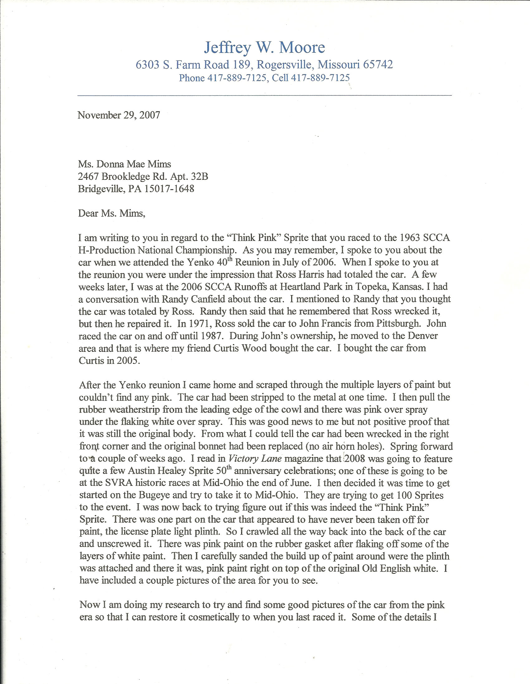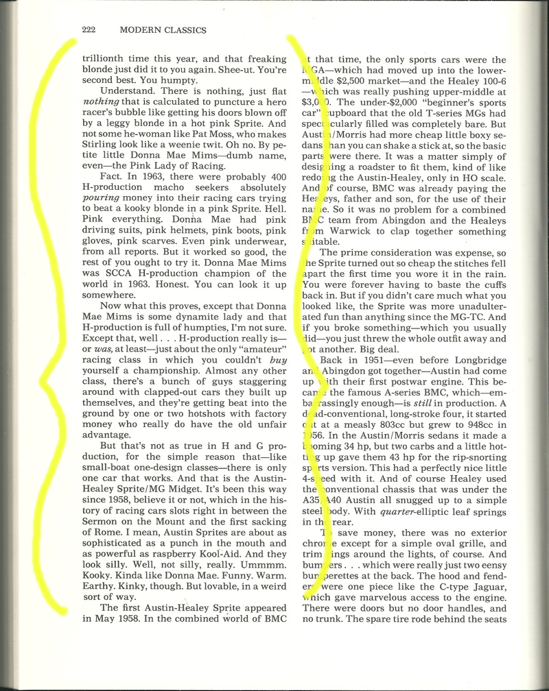 Ms. Mims competed with the Sprite at many famous race circuits such as: VIR, Road America, Marlboro, Mid-Ohio, Road America, Watkins Glen, Bridgehampton, Lime Rock, Meadowdale, Thompson, and Lake Garnett. Ms. Mims would later go on to compete in several Daytona 24hrs, 12hrs of Sebring, SCCA Trans Am, and IMSA events. Several of these races she was a member of the Ring Free Oil Company “all female” race team.
