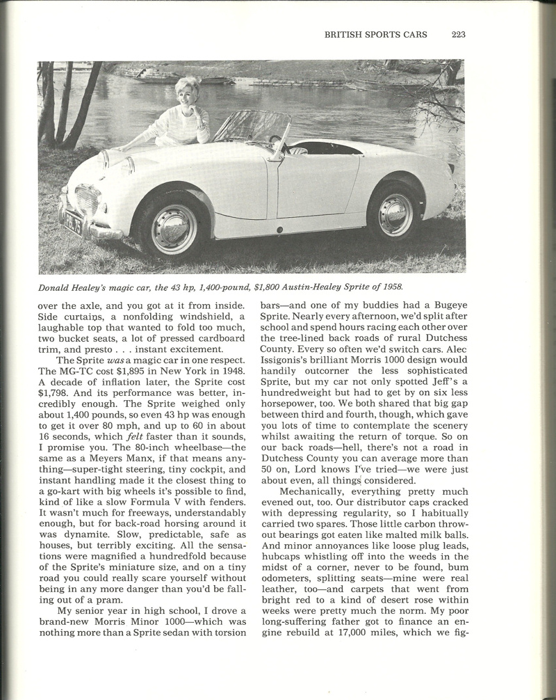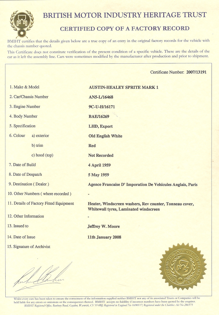 ownership provenance, competition pedigree, and detailed restoration claimed by this fine example. According to a BMHT certificate, this car was built on April 4, 1959, and dispatched from the factory a month later. Distributed to Paris for retail, the Sprite was purchased by Dr. Jonas Salk, the famed developer of the polio vaccine, who imported the car to the US and used it as a daily driver around the University of Pittsburgh campus where he worked.