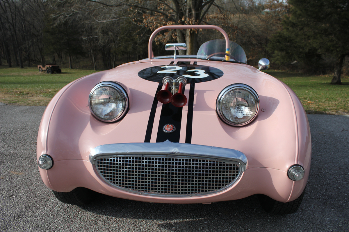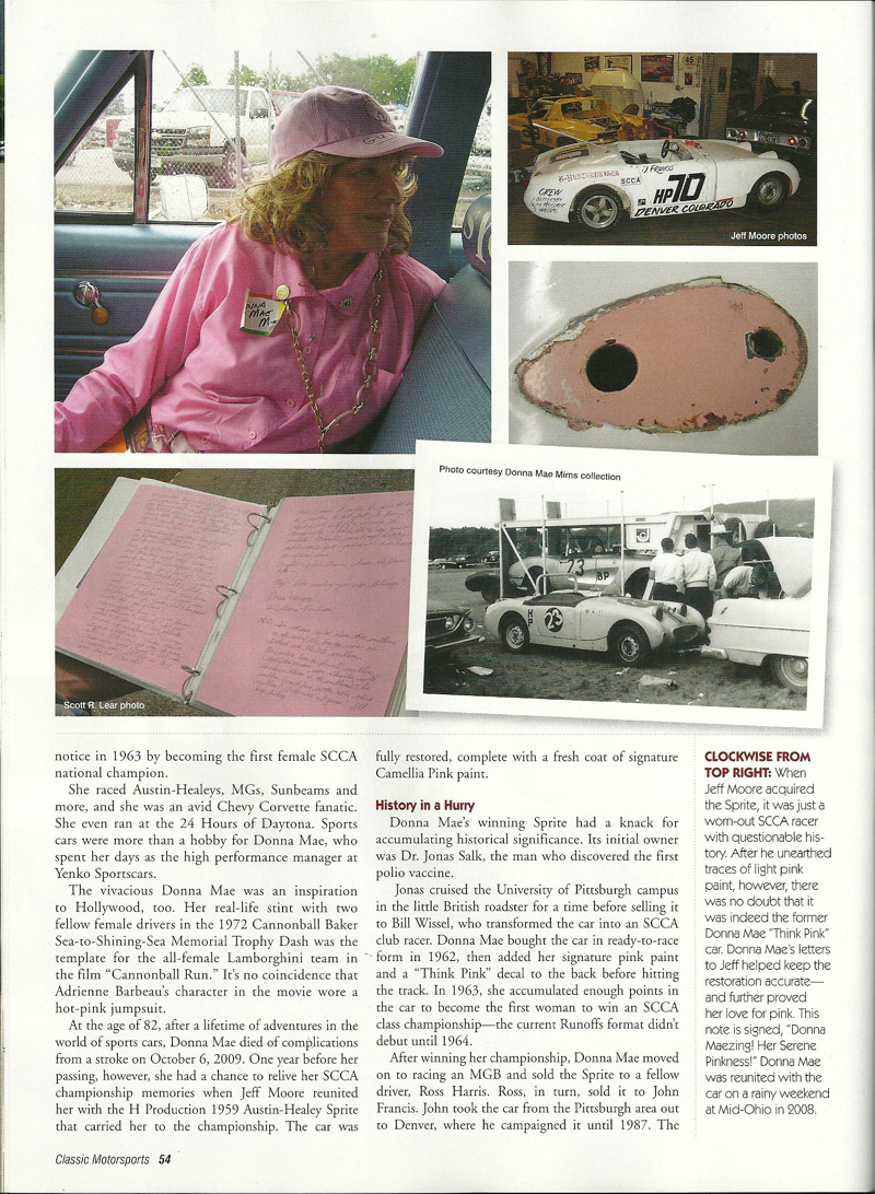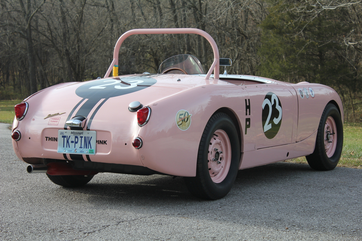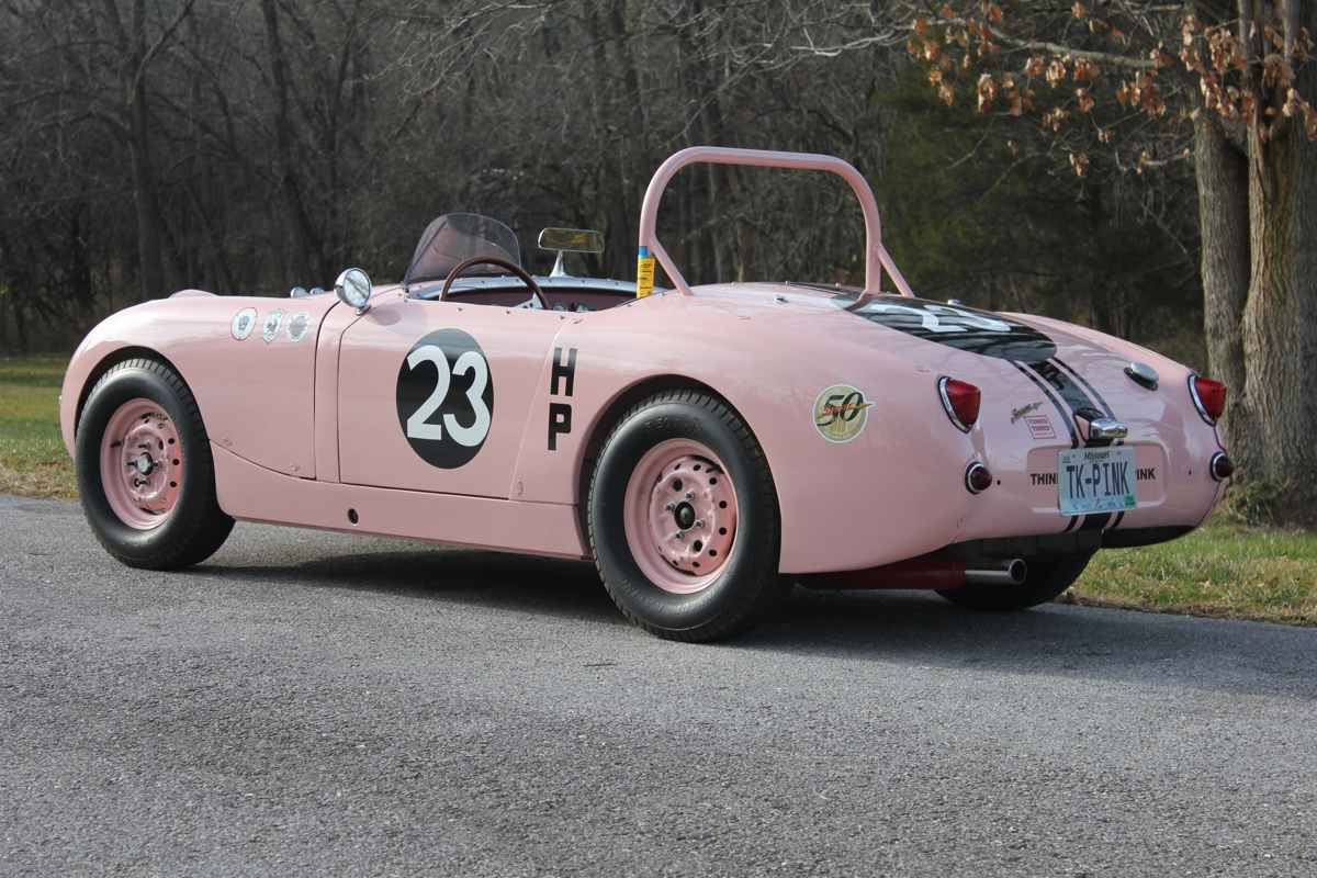 Dr. Salk soon sold the Sprite to Bill Wissel of Pittsburgh, who prepared it for SCCA racing. In 1962, Mr. Wissel sold the car to its most memorable owner, trailblazing racer Donna Mae Mims. Ms. Mims was Media Relations, and later, Hi Performance Manager for the Legendary Yenko Sport Cars. Donna Mae’s chance meeting in 1960 with Gulf Oil Company executive Grady Davis led to Gulf Oil sponsorship for Don Yenko’s racing Corvettes and many famous race teams to follow such as the JWAE Ford GT40’s and John Wyer’s Porsche 917s. Donna Mae was also the inspiration for the unforgettable Adrienne Barbeau character in the film The Cannonball Run, Ms. Mims is noted among Yenko enthusiasts for her triumphs in Corvettes, but she sealed her renown with this Sprite, which she repainted in her trademark pink.