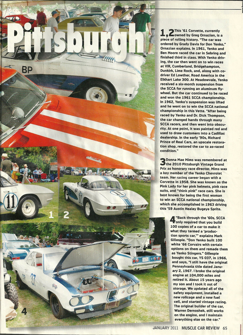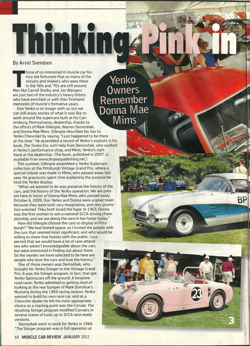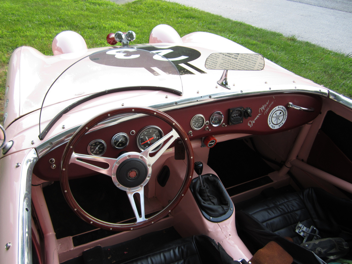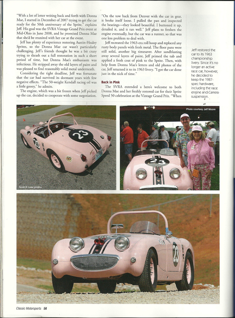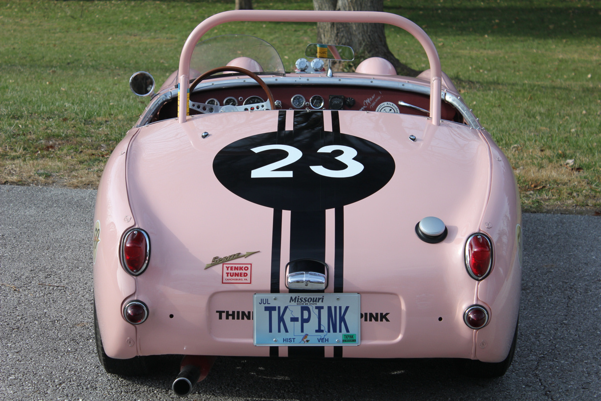 Dr. Salk soon sold the Sprite to Bill Wissel of Pittsburgh, who prepared it for SCCA racing. In 1962, Mr. Wissel sold the car to its most memorable owner, trailblazing racer Donna Mae Mims. Ms. Mims was Media Relations, and later, Hi Performance Manager for the Legendary Yenko Sport Cars. Donna Mae’s chance meeting in 1960 with Gulf Oil Company executive Grady Davis led to Gulf Oil sponsorship for Don Yenko’s racing Corvettes and many famous race teams to follow such as the JWAE Ford GT40’s and John Wyer’s Porsche 917s. Donna Mae was also the inspiration for the unforgettable Adrienne Barbeau character in the film The Cannonball Run, Ms. Mims is noted among Yenko enthusiasts for her triumphs in Corvettes, but she sealed her renown with this Sprite, which she repainted in her trademark pink.